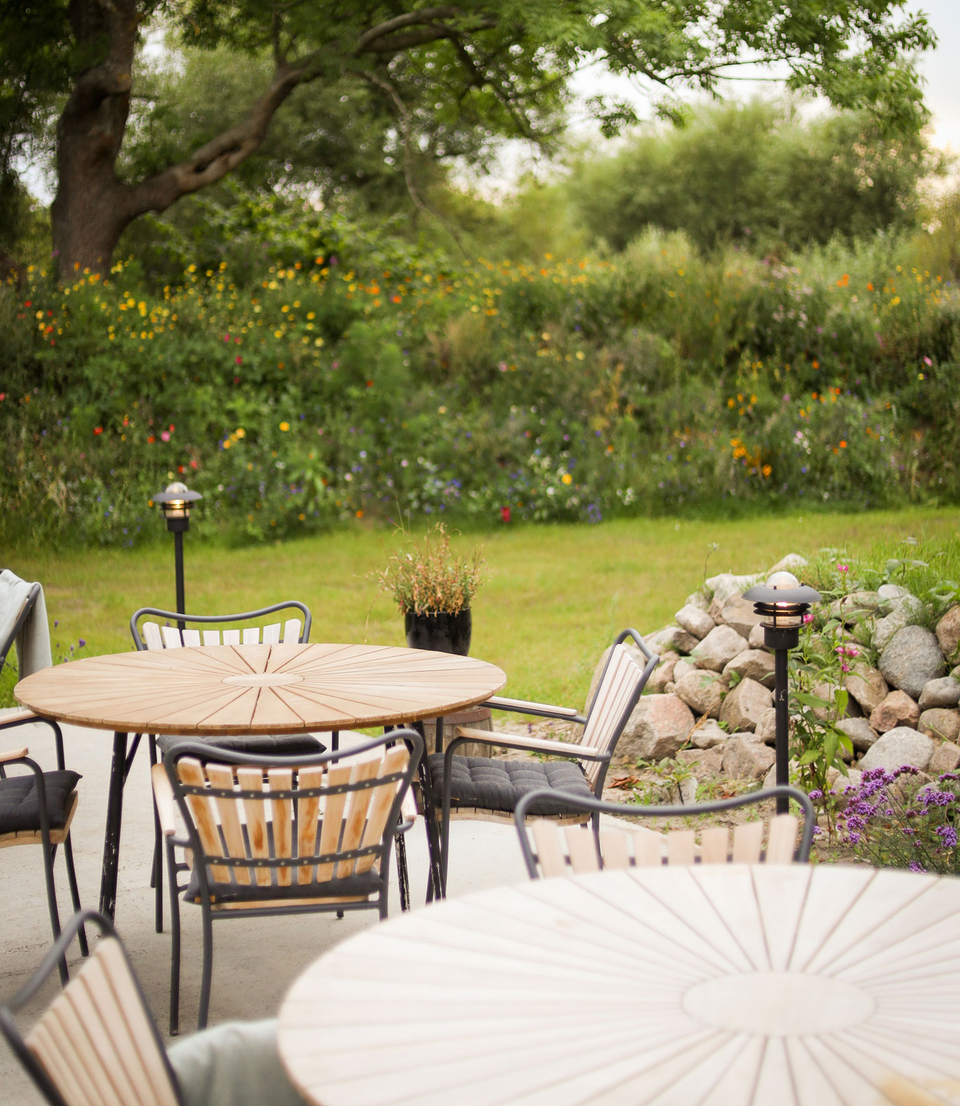 En stor åbning ud mod haven skaber forbindelse til en mini-park med en stor stenterrasse omgivet af en græsplæne. Her kan der sættes sejl op, så området også kan benyttes i regnvejr.